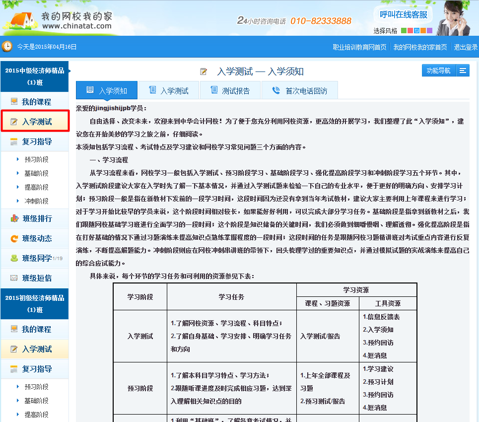 经济师精品班“入学测试”介绍页